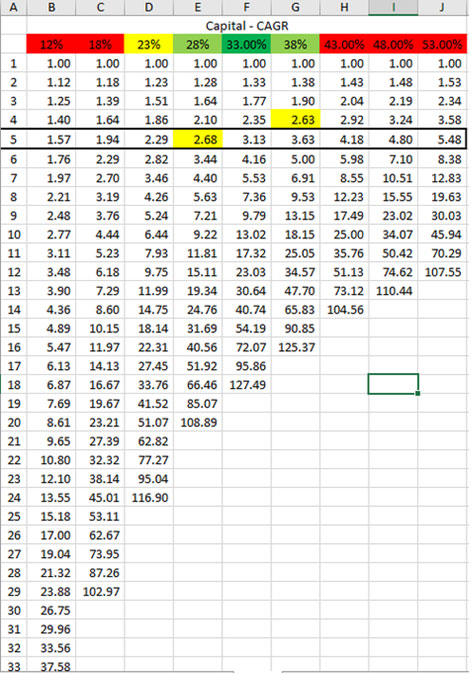 - Going by this logic, the sweet spot lies with the CAGR component of 28% to 38% where 100x might be possible within 16 to 20 years with minimal calculated RISK.
